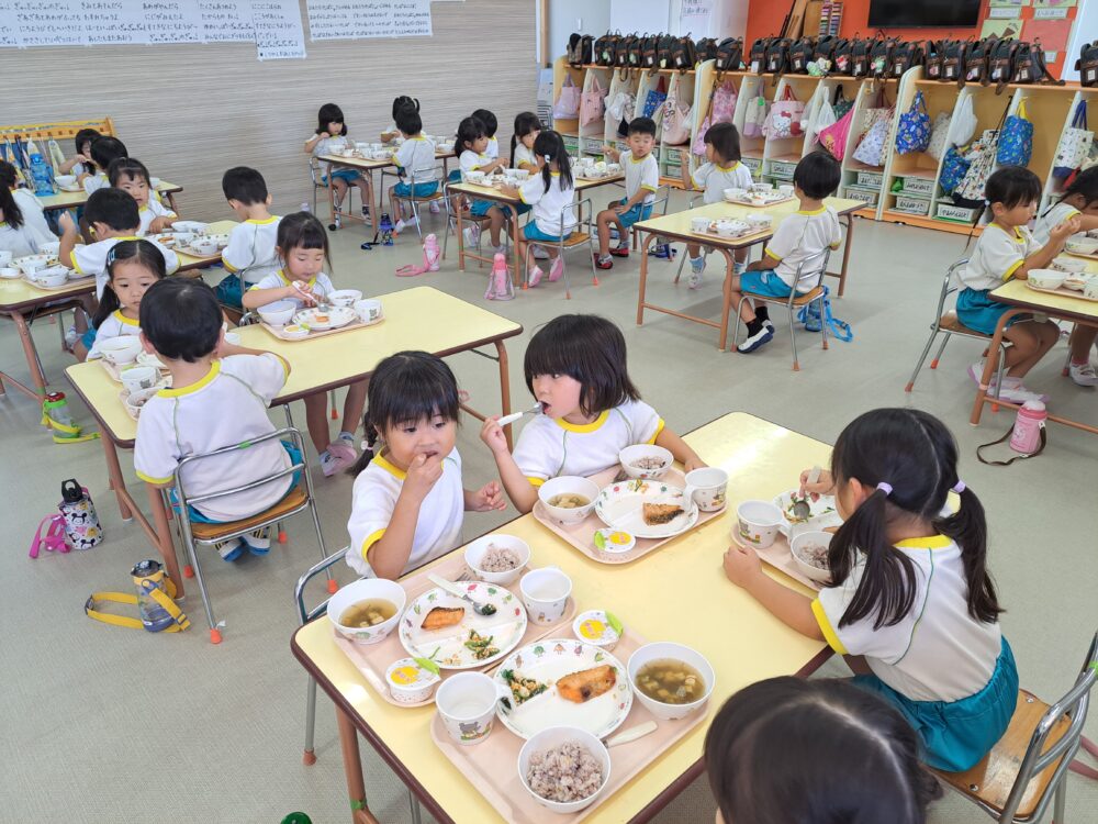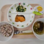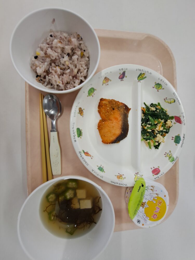 給食(十五穀米・ほうれん草の白和え・ごまみそ焼き・オクラすまし汁)
