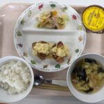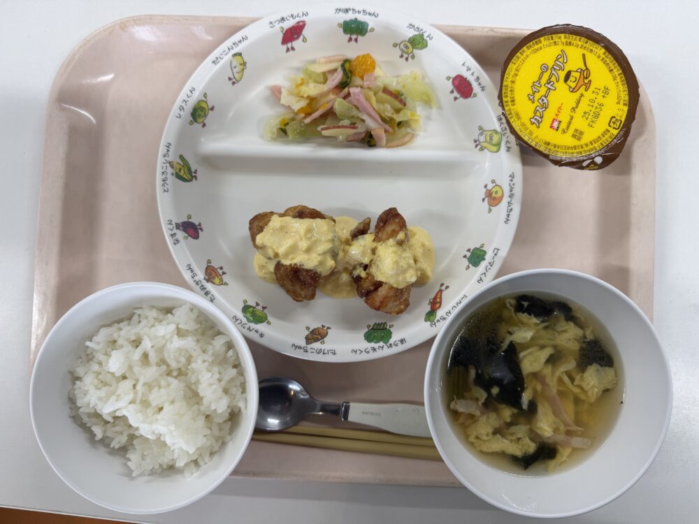 給食(ご飯・チキン南蛮・フレンチサラダ・ほうれん草と卵のスープ)
