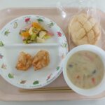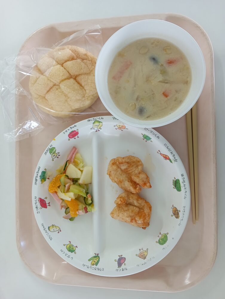 給食(メロンパン・ささみのレモン風味・フレンチサラダ・豆乳スープ)