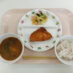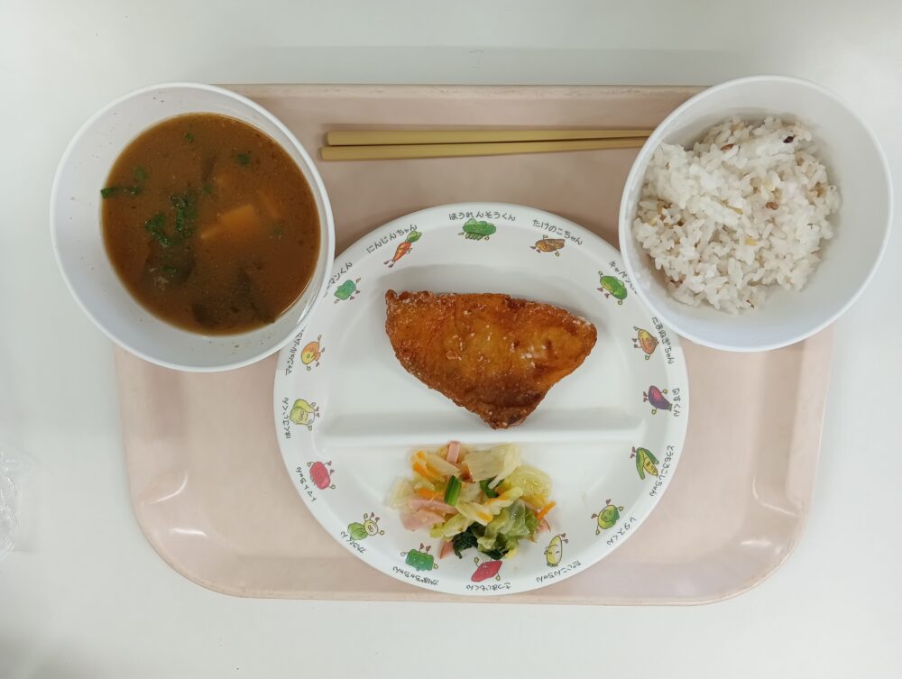 給食(十五穀米・ぶりの竜田揚げ・野菜のスタミナ和え・なめこ汁)