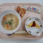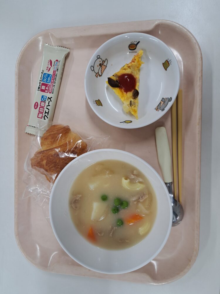 給食(クロワッサン・クリームシチュー・スパニッシュオムレツ・カルシウムウエハース)