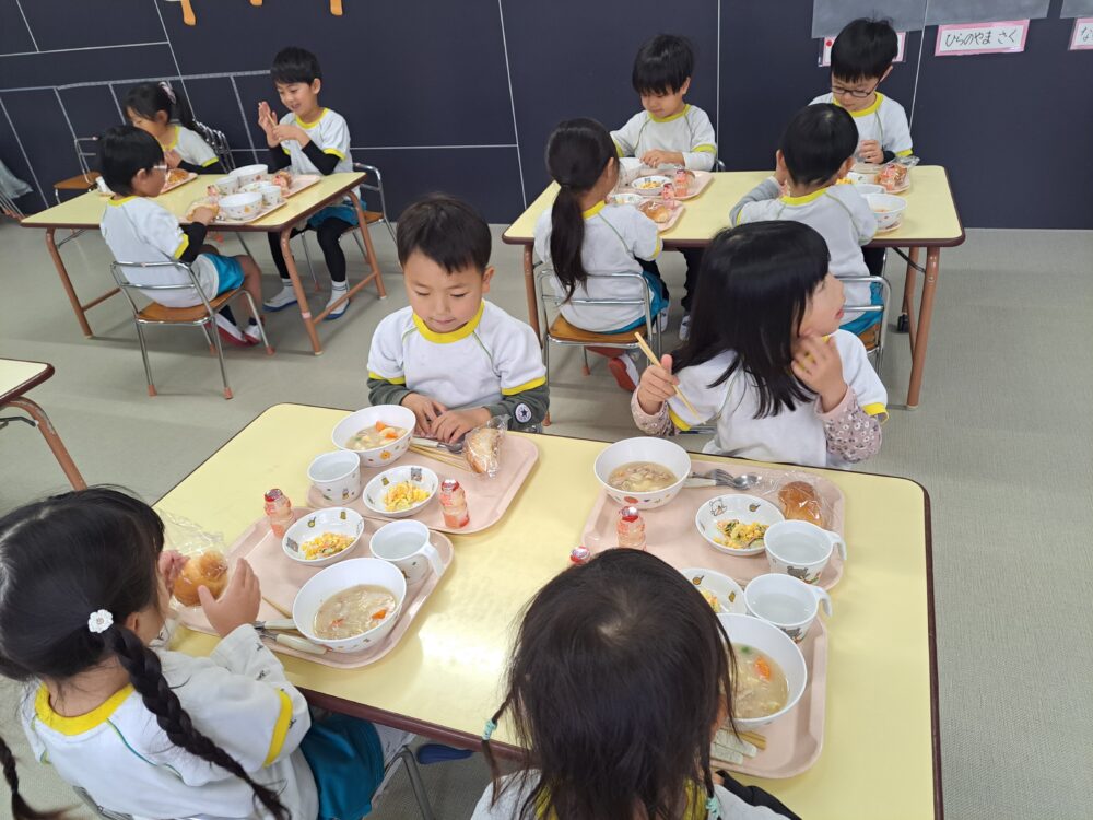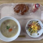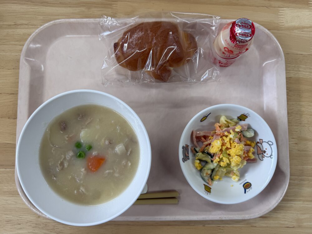 給食(ロールパン・クリームシチュー・ミモザサラダ・ヤクルト)