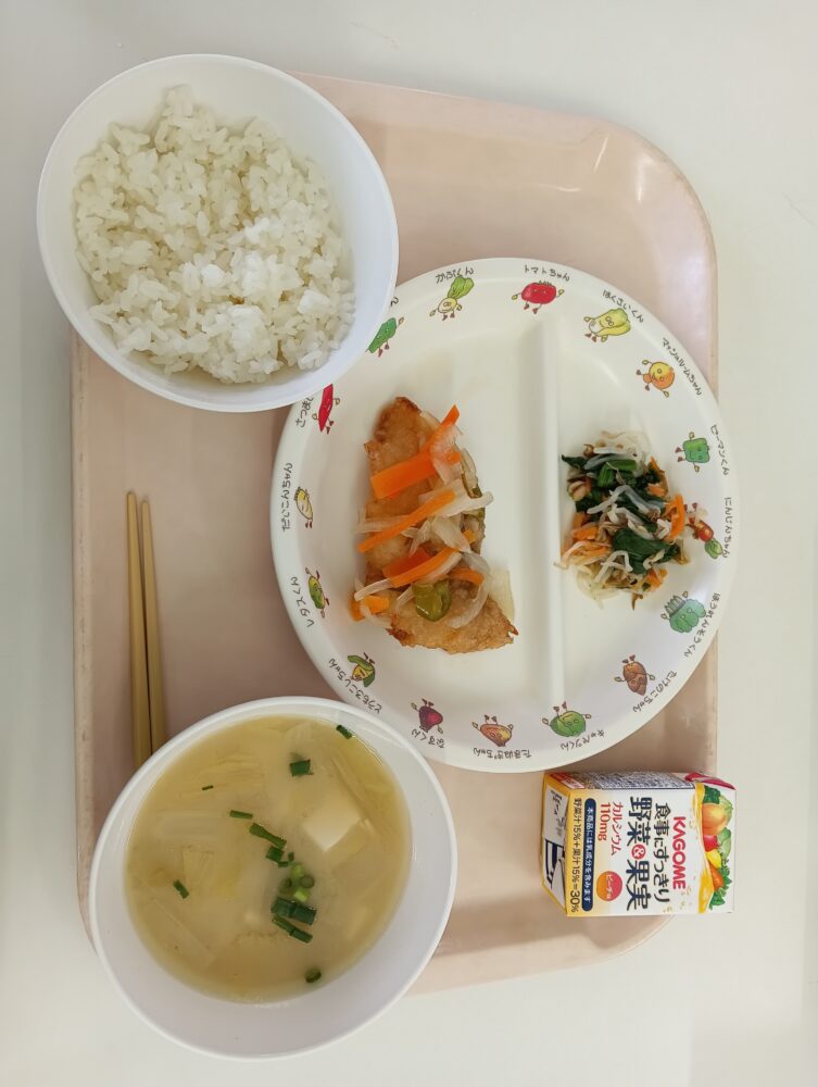 給食(ご飯・魚の南蛮漬け・ナムル・みそ汁・野菜ジュース)