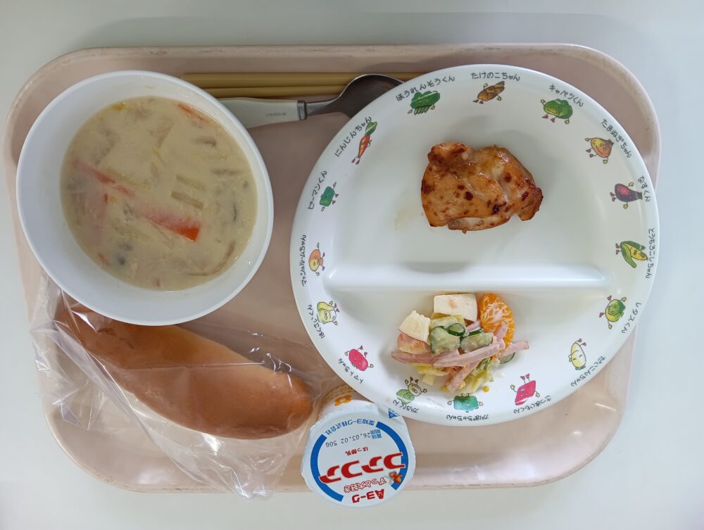 給食(ご飯・チーズハンバーグ・野菜のスタミナ和え・ポパイスープ)