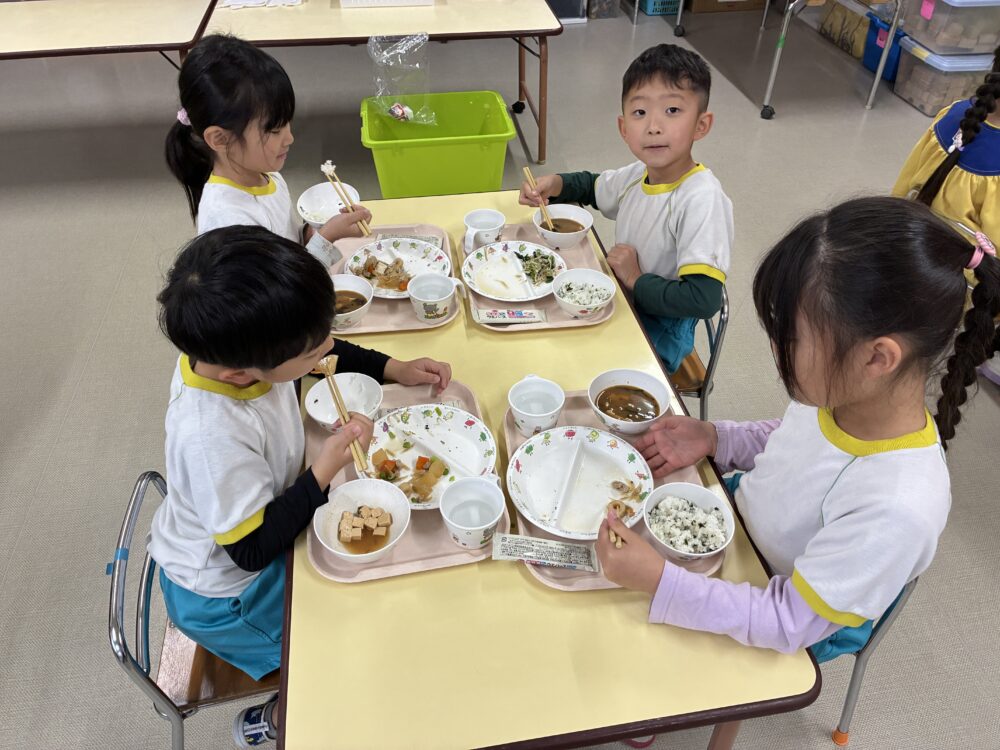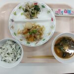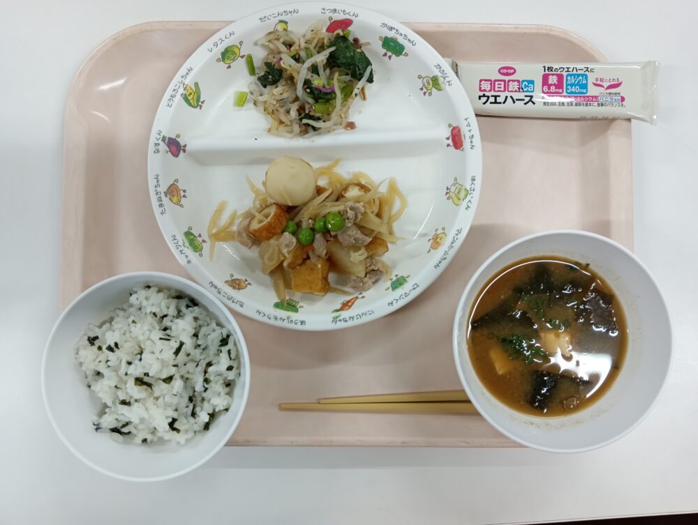 給食(わかめご飯・筑前煮・小松菜の梅しらす和え・なめこ汁・カルシウムウエハース)