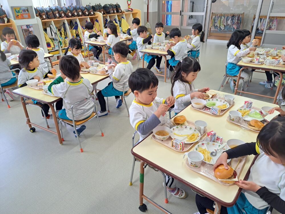 給食(ハンバーガー・フライドポテト・オニオンスープ・野菜ジュース)