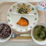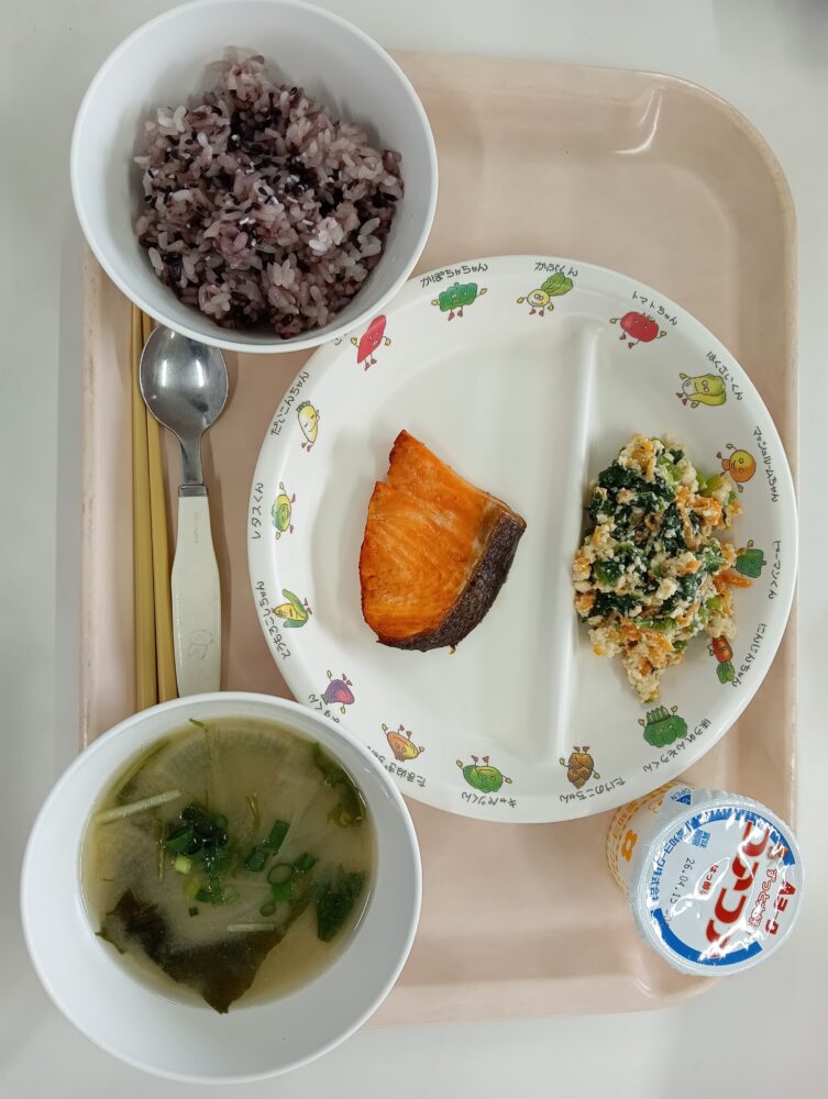 給食(黒米・鮭の塩焼き・ほうれん草の白和え・みそ汁)