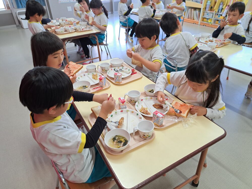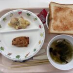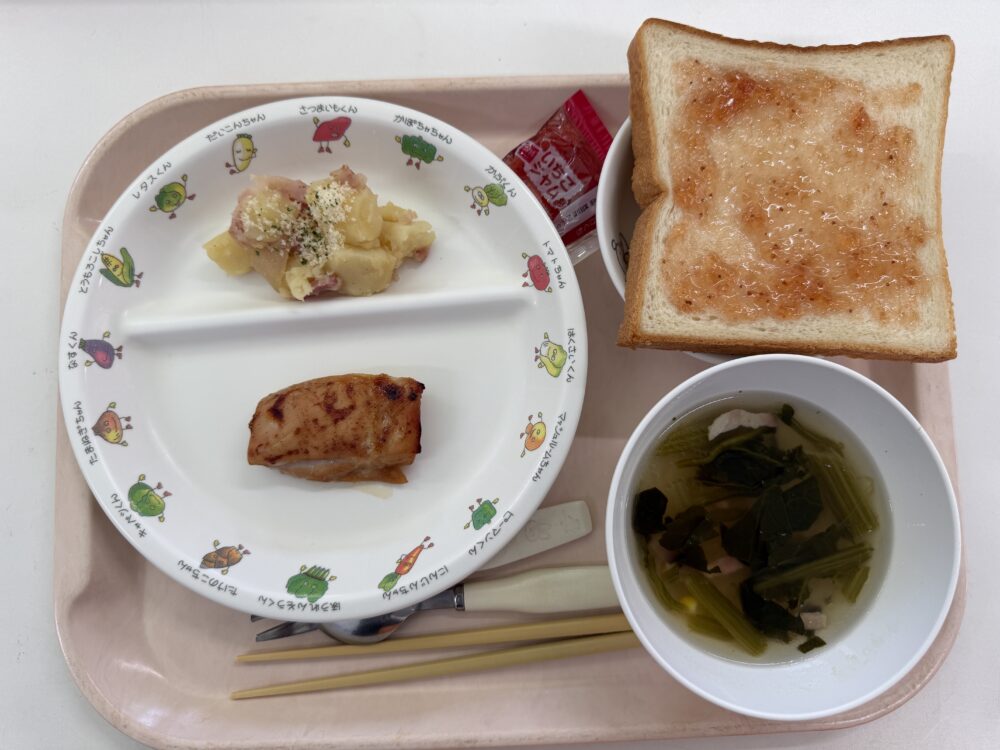 給食(食パン・照り焼きチキン・ジャーマンポテト・ポパイスープ・野菜ジュース)