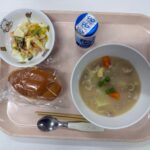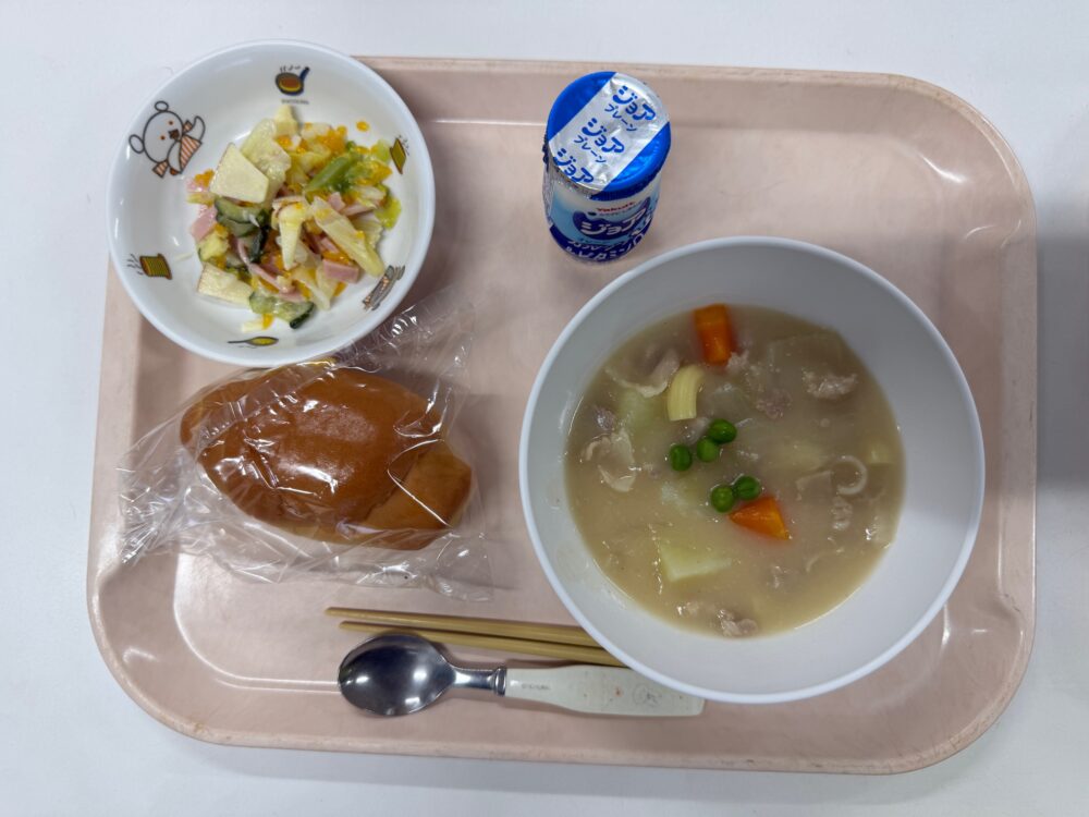給食(ロールパン・クリームシチュー・フルーツサラダ・ジョア)