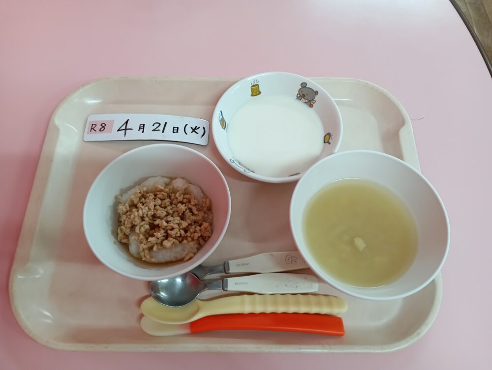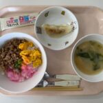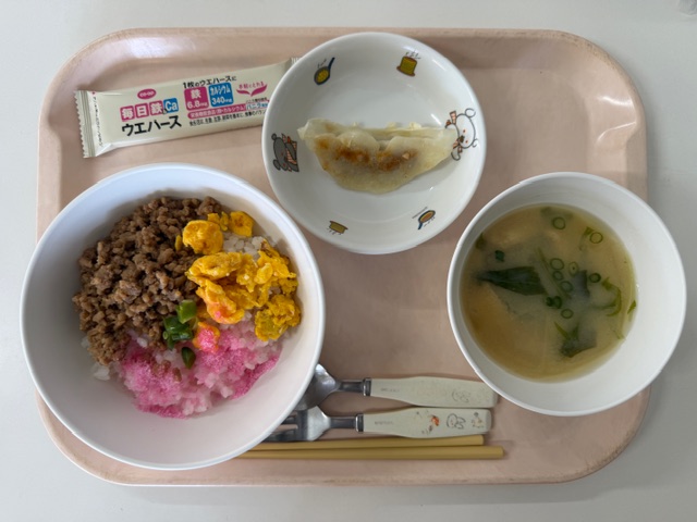 給食(三食丼・ぎょうざ・みそ汁・カルシウムウエハース)