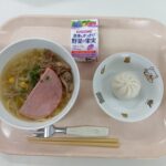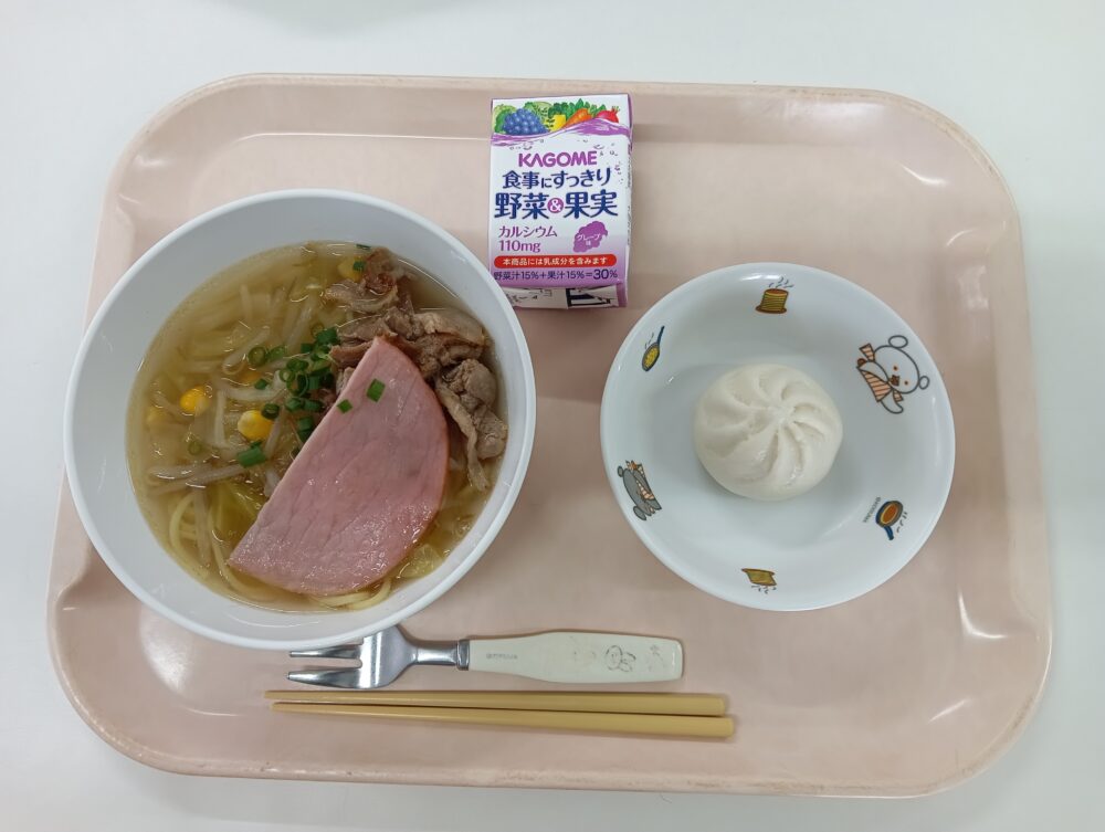 給食(塩ラーメン・肉まん・野菜ジュース)