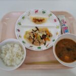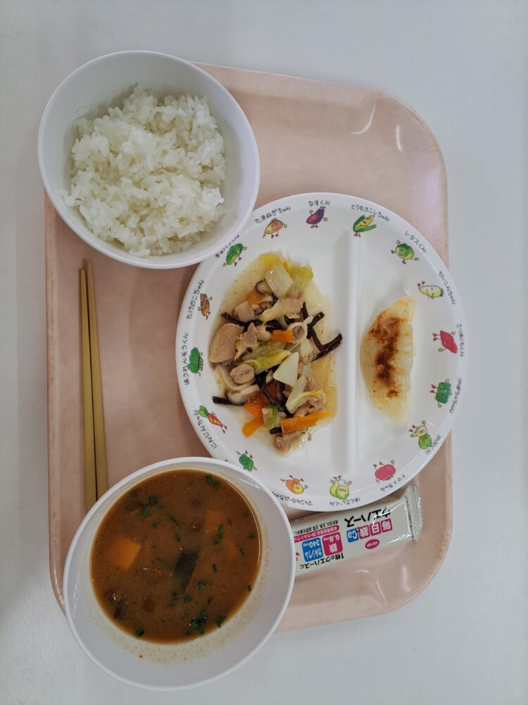 給食(ご飯・八宝菜・餃子・みそ汁・カルシウムウエハース)