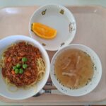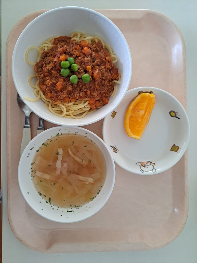 給食(ミートスパゲティ・オニオンスープ・果物)