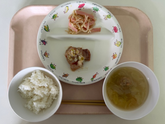 給食(ご飯・ねぎ塩チキン・もやしカレードレッシング・肉団子スープ)
