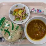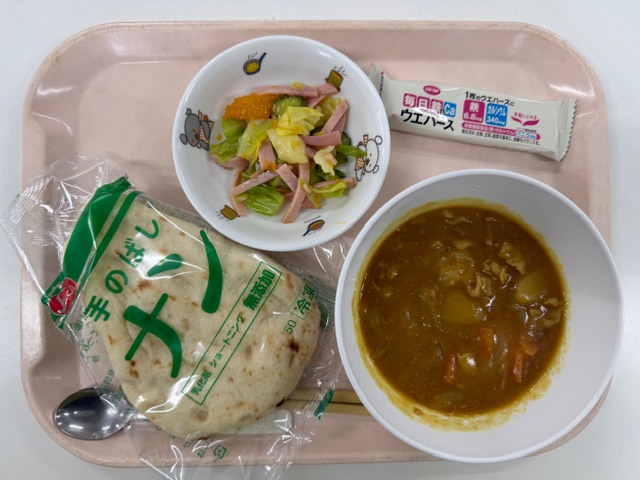 給食(ポークカレー・ナン・フレンチサラダ・カルシウムウエハース)