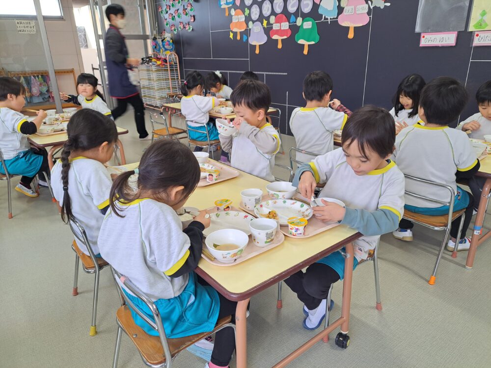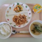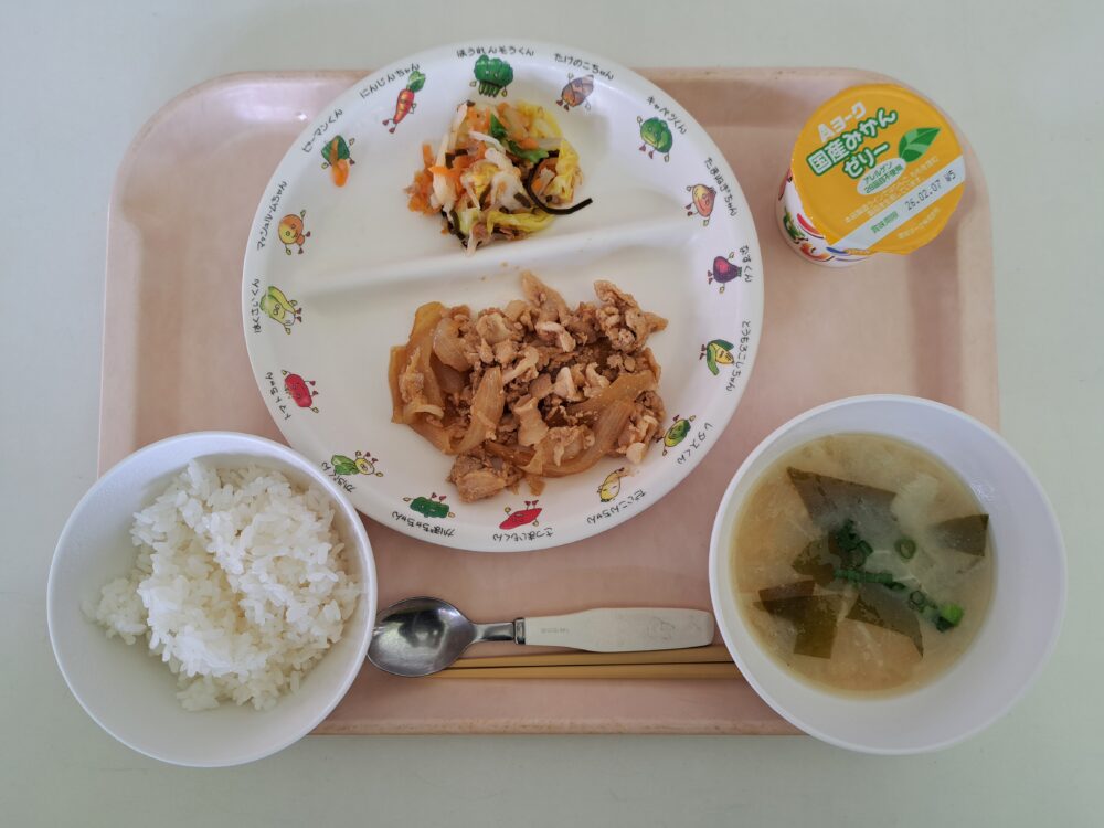 給食(ご飯・豚肉の生姜焼き・白菜の昆布和え・みそ汁・みかんゼリー)