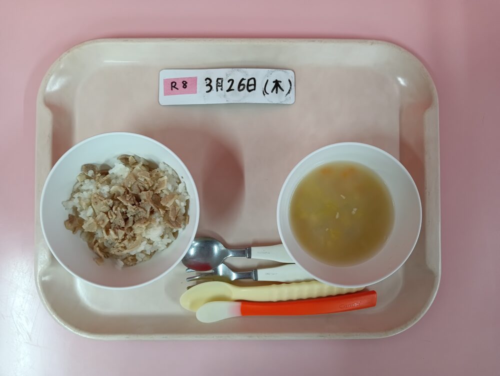 給食(コッペパン・ローストチキン・マカロニサラダ・春雨スープ・果物)