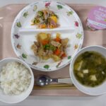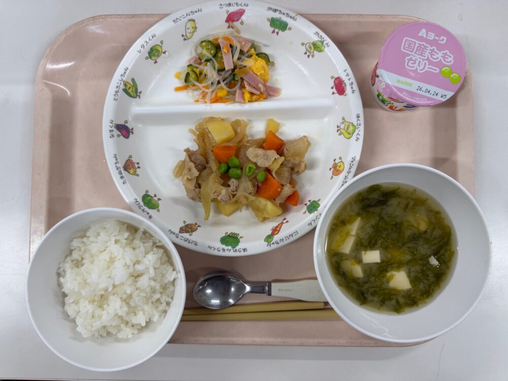 給食(ご飯・肉じゃが・春雨の酢の物・あおさのみそ汁・ももゼリー)
